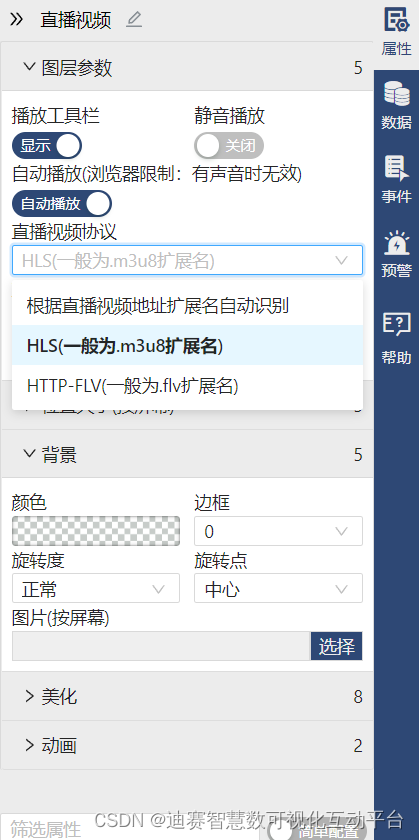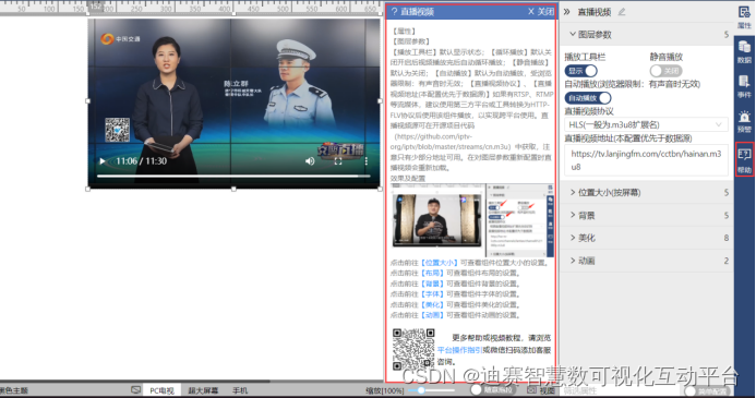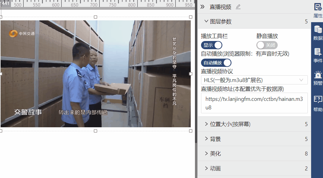 在右侧属性当中配置对应网址就可以看到对应的直播视频,但是一般都为.m3u8和.flv后缀的地址,或者也可以把RTSP、RTMP等流媒体,建议使用第三方平台或工具转换为HTTP-FLV协议后才可以该组件播放。
