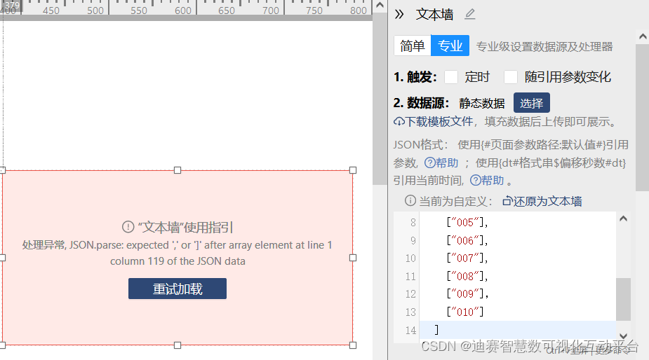 该组件的格子数显示为九个,也就是说该组件的数据填充次数为九次,也不要在专业模式里添加多值,下面演示错误实例