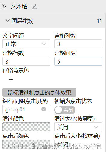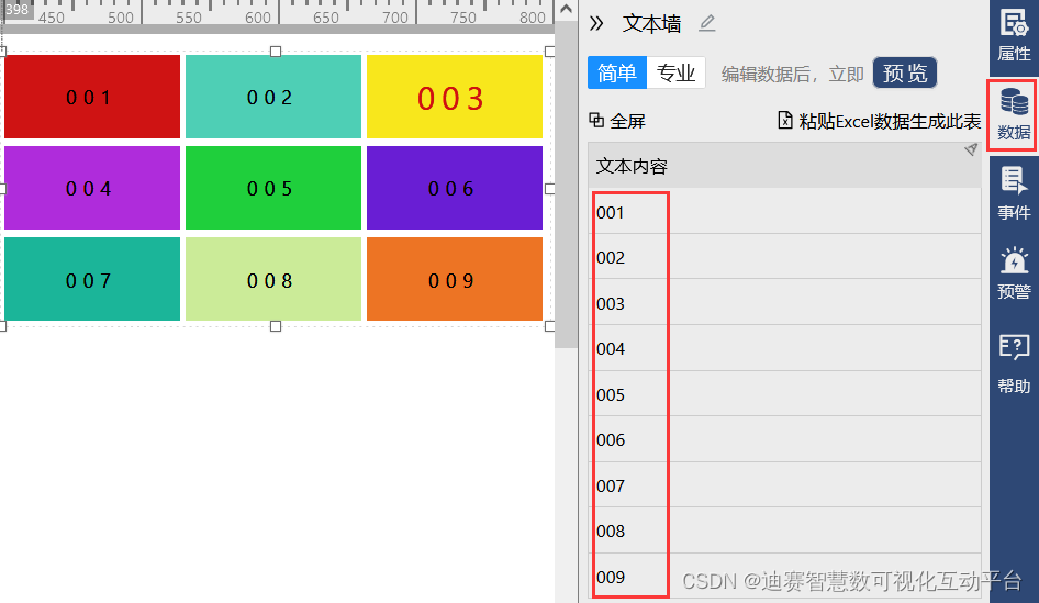 在数据选项,可以对该组件的数据进行更改,该组件的简单性,也造就了数据填充的便利性,在文本内容下方每行字符代表组件格子内容的展示。