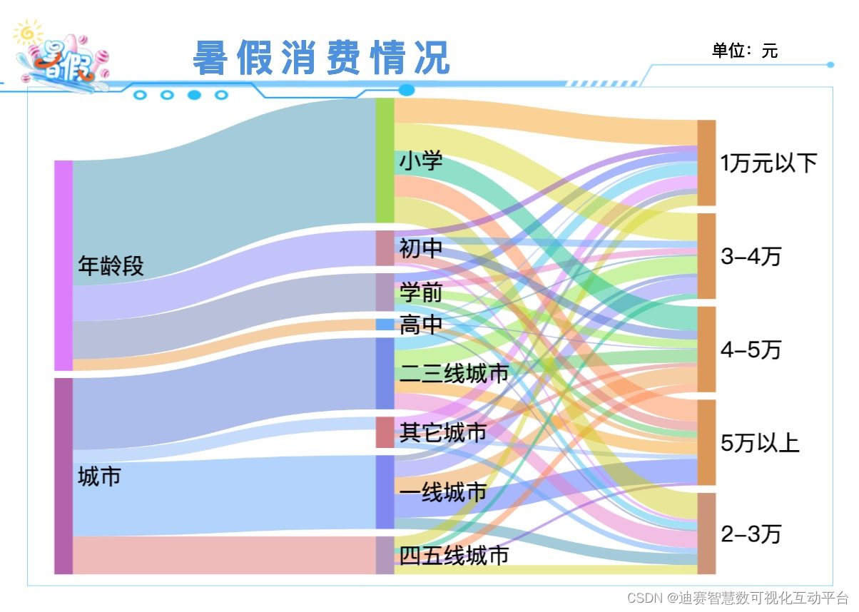 从年龄段看小学阶段花费最多,甚至超过学前阶段和初高中阶段的总和;从城市看,一线城市花费最多,其中一线城市在暑假花费5万元以上较多;其次是二三线城市和四五线城市普遍花费在2-3万和3-4万。