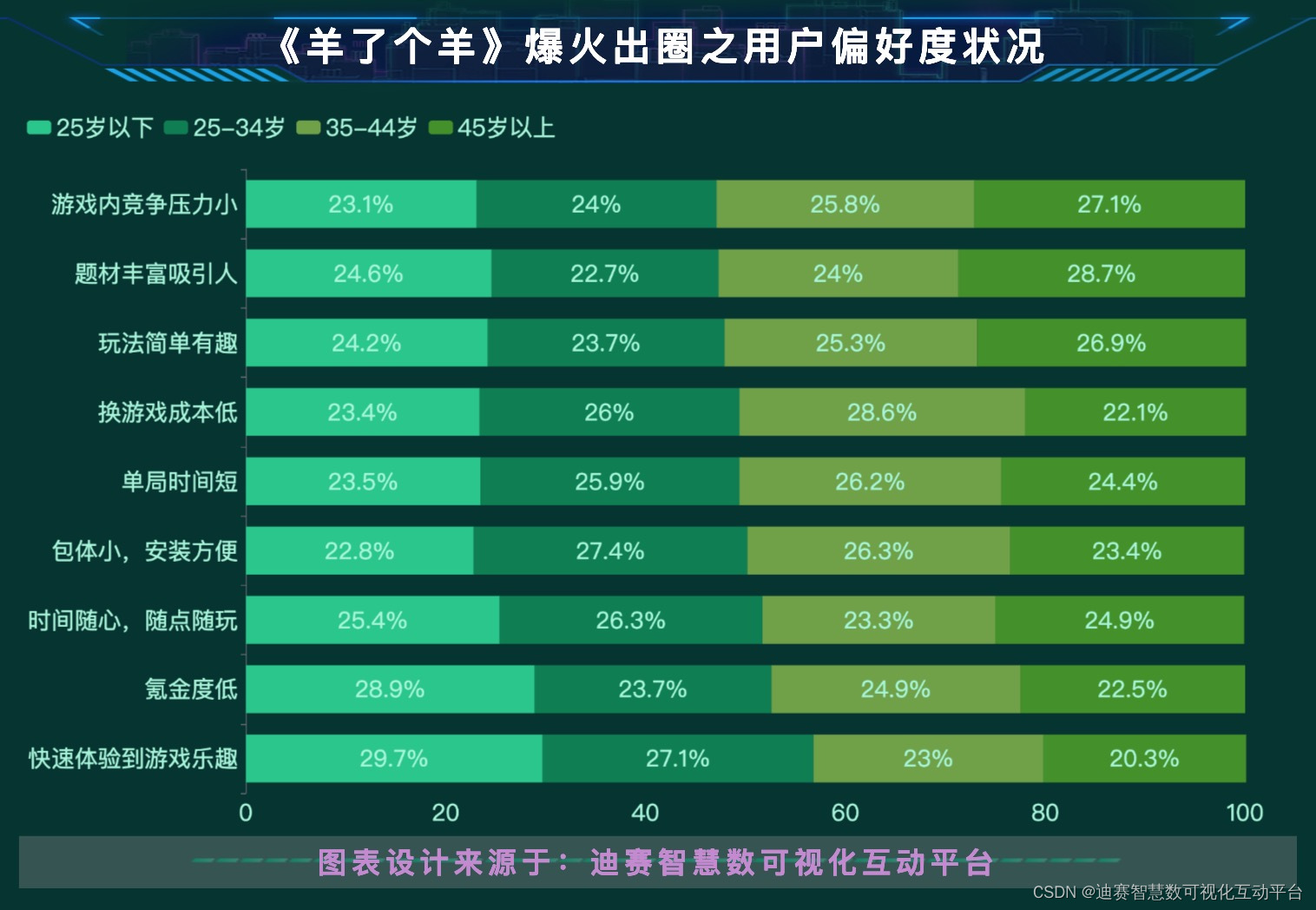 《羊了个羊》在疫情中迅速走红,成为众多用户消磨时间的选择。数据显示,游戏的快速体验、低氪金度、随开随玩等特性受到不同年龄层玩家的欢迎,尤其是年轻人。堆叠柱状图揭示了各年龄段玩家对于游戏特性的偏好,其中,游戏乐趣、低消费和灵活游玩时间是最主要的吸引力。然而,过多的堆叠颜色可能导致视觉混乱。
