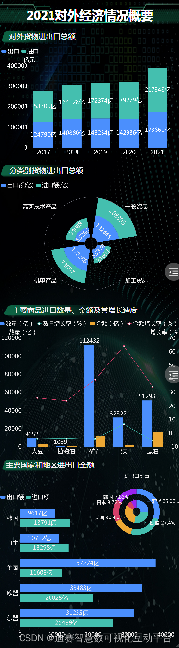 下面是小编对国家统计局最新发布的报告进行报表数据处理分析后得到的数据可视化图表,展示了2021年我国对外经济发展情况的概要情况,大家来看下吧。