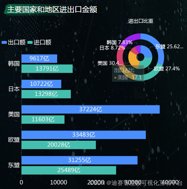 2021年主要进口金额最多的地区是东盟,占进口总额的14.7%,出口金额最多的地区是美国和欧盟地区,占出口总额的17.1%和15.4%。