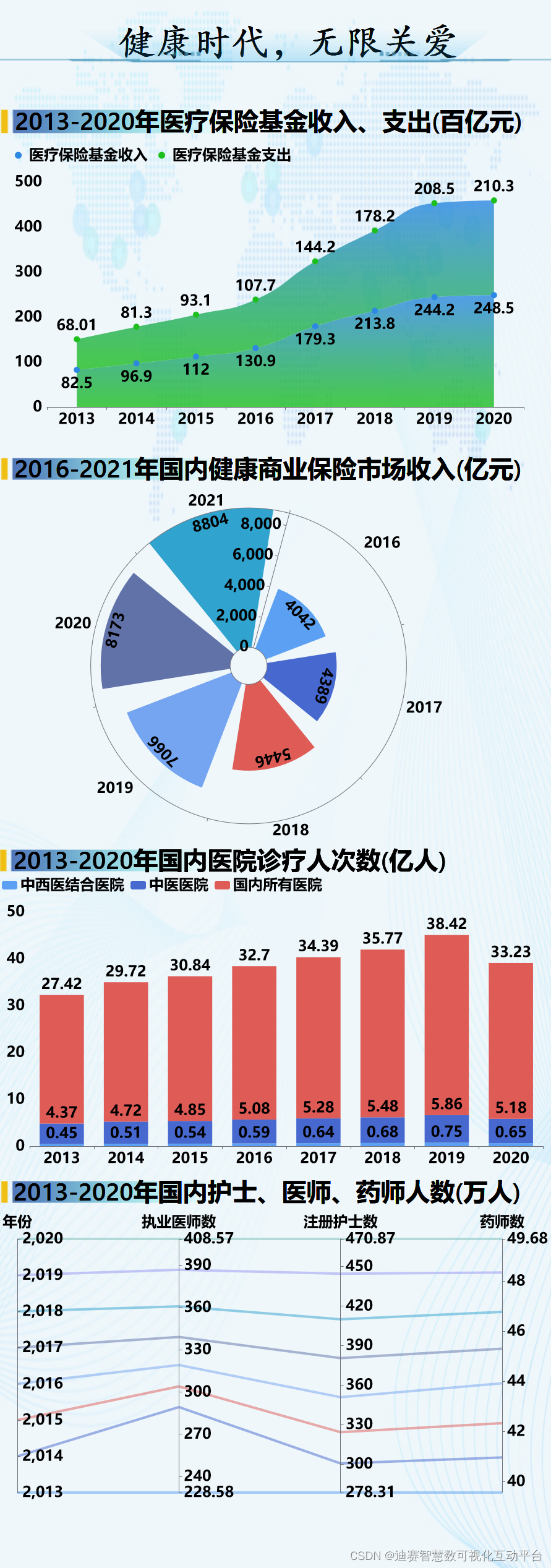 近年来国内经济发展迅速,人们愈发注重身体健康,身体好才是好,但凡生点病人不仅难受,钱包也难受,但随着医保的到来,看病花钱不再难。现如今医疗保险可以说是“人手一个”,医保电子凭证和异地就医便民政策的到来,为群众带来的极大的便利性。下面小编整理了相关的部分数据,利用数据可视化软件展示方便大家观看。