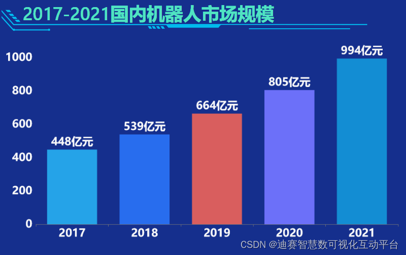 机器人好处坏处并存,可以长时间工作,保证产品一致性,可远程操作等。坏处也由为明显,造成人员失业,出现问题需要专业技术人员解决等。那么国内机器人市场到底怎么样呢?根据下方数据可视化图我们可以看到,机器人行业一直呈现增张趋势,22年也由可能突破千亿大关。