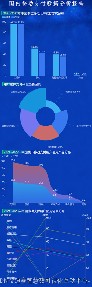 移动支付可以让用户在线上和线下便捷、安全的完成付款,且支付方式多样化、减少找零的环节,深受广大群众喜爱。下面小编准备了一些国内移动支付的相关数据,通过数据可视化平台实现把数据可视化的展现出来,以此方便大家观看。