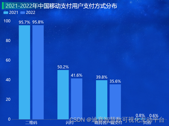 根据数据可视化图显示,2022年二维码支付依然是移动支付主流支付方式,其占比达到95.8%,也有部分用户会使用闪付和跳转客户端方式,其用户占比也在41.6%、35.6%。