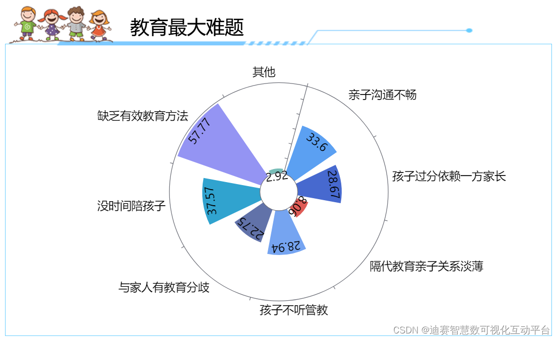 缺乏有效的教育方法是父母教育中遇到最大的问题,占57.77%,教育凭感觉、缺方法,父母育儿分歧直接影响亲子关系;其次是没时间陪孩子,占37.57%;第三点是亲子沟通不畅占33.6%。