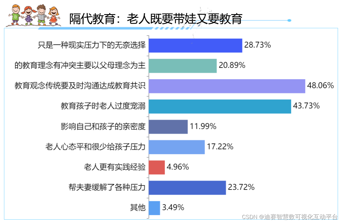 对于隔代教育的意见,48.06% 的家长认为老人的教育观念比较传统,要沟通达成共识,43.73% 的家长认为老人教小孩会被宠坏。此外,28.73% 的家长认为隔代教育只是现实压力下的一种无奈选择。
