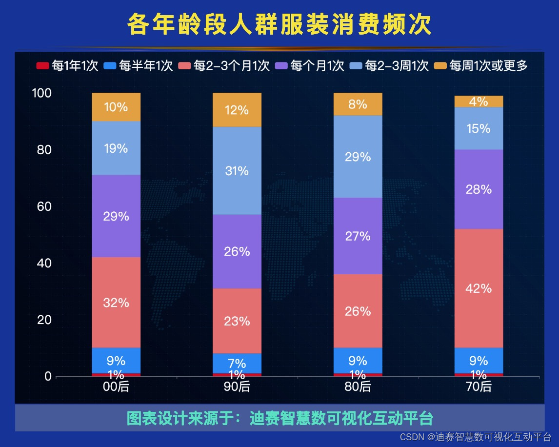 文章揭示了不同年龄段人群购买新衣服的频率,90后尤为频繁,平均每周1次或以上的占比达到12%,成为服装消费主力军。堆叠柱状图展示了各年龄段的消费习惯,强调了90后的感性购物趋势,而服装的必需性似乎在新一代消费者中减弱。