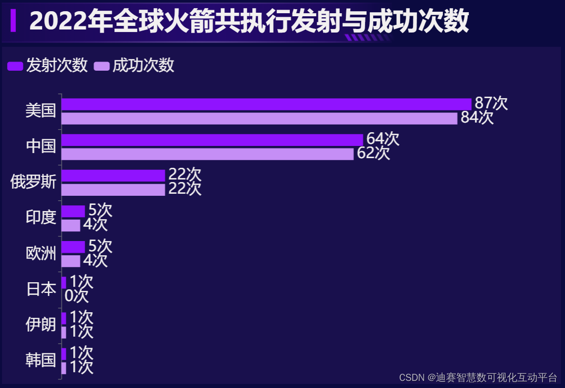 2022年火箭执行发射最多的国家是美国与中国,美国发射次数87次,成功发射84次,中国发射次数64次,成功发射62次。
