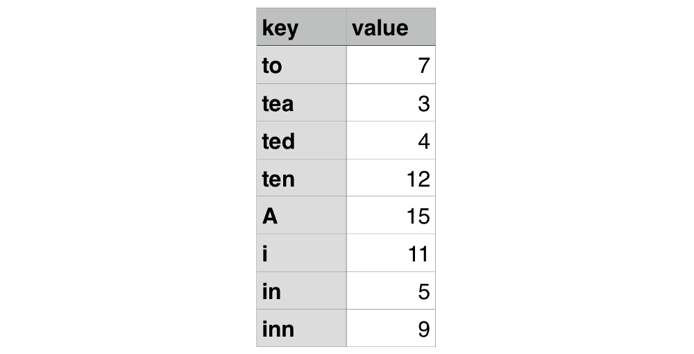 如果你还不了解什么是字典树,下面做简单的介绍:假设我们有一个简单的对象,键值的对应关系如下: