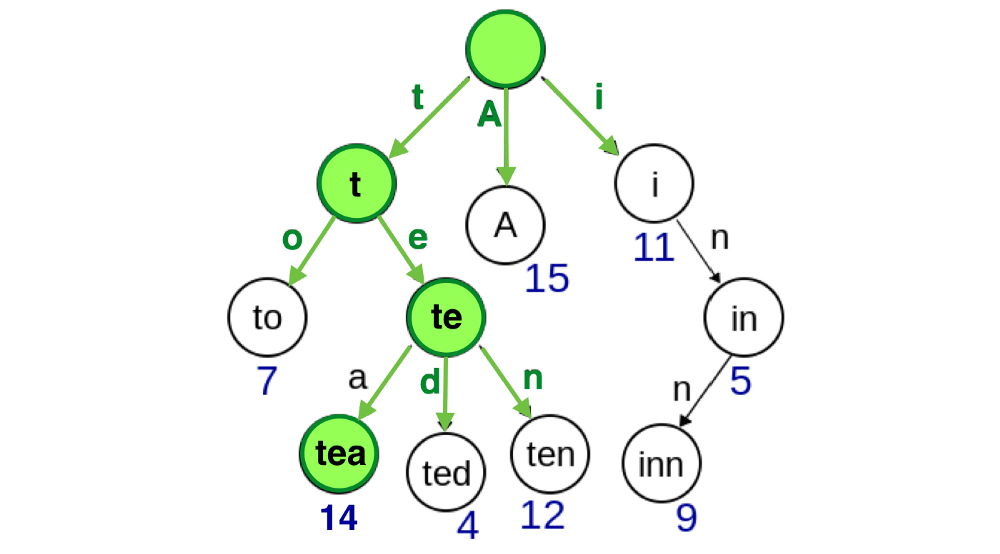 我们根据「键」的字母出现顺次构建出一棵树出来,叶子节点值即有可能是某个「键」的值