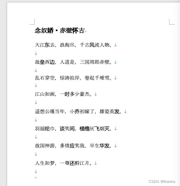 苏轼的《念奴娇·赤壁怀古》,创作后的word文档内容如下图: