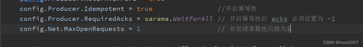 config.Producer.RequiredAcks = sarama.WaitForAll // 开启幂等性后 acks 必须设置为 -1