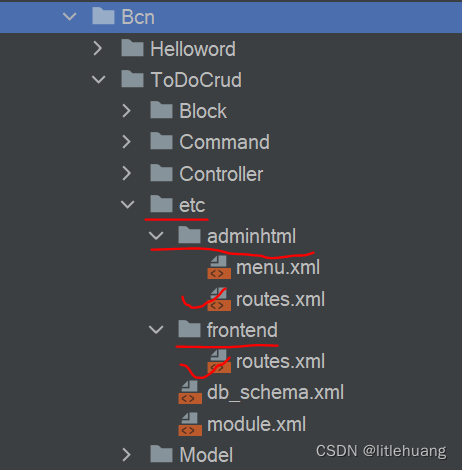一般来说,etc中需要包含两个文件夹,frontend(前端路由文件夹)和 adminhtml(后台管理路由文件夹),分别在这两个文件夹中创建路由文件routes.xml,用来管理每个模块(前端和后台)。目录结构如下: