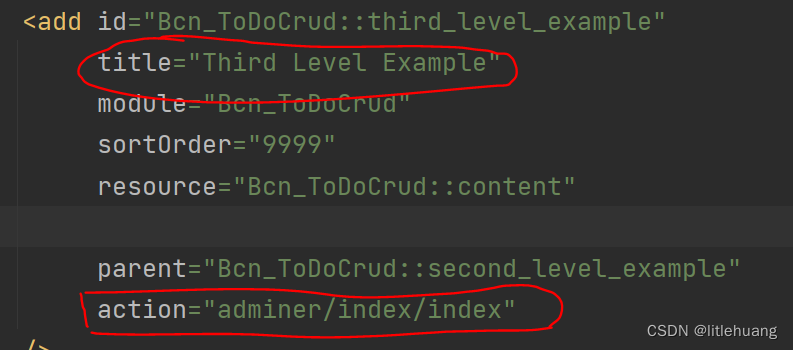 可以参考上一节新增菜单项的内容,这里将上节三级子菜单 Third Level Example的<action>属性修改为Controller下要链接的功能(route文件中起的前名/控制器名/控制器下的php类名),本例为"adminer/index/index"。