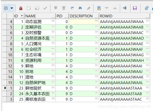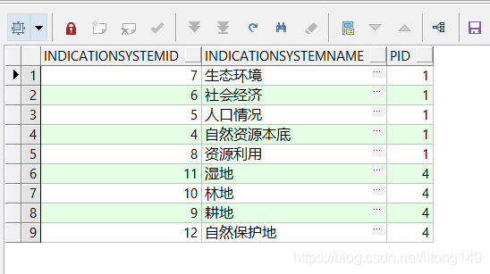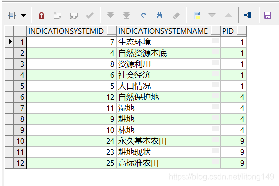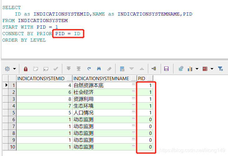 注意:此关系中PID为父节点,ID为子节点,PID从1开始,向下查询