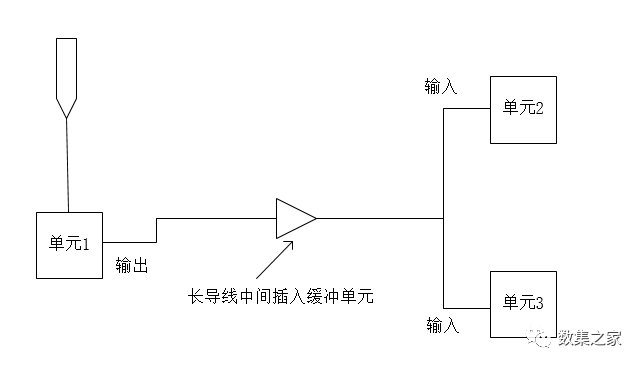 随着工艺尺寸的不断缩小,其线延时增加与线长近似成正比指数性关系,而增加缓冲单元个数与延时近似成正比线性关系。那么在单元位置比较合理,同时单元驱动力已经达到最大时的情况下,如果单元驱动信号线负载仍然过大而导致延时过大的情况,可以通过在长距离信号线中间增加合适的缓冲单元来提高延时性能,如下图所示。