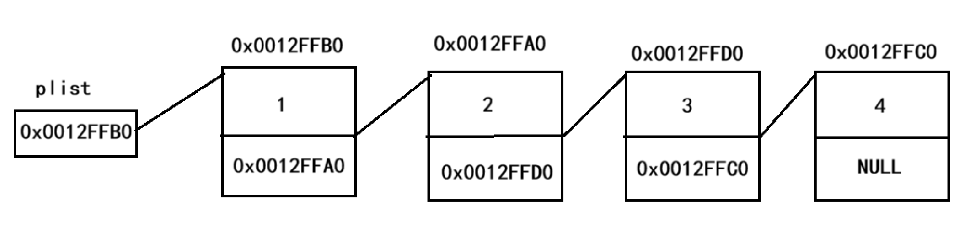 图中指针变量plist保存的是第一个节点的地址,我们称plist此时指向第一个节点,如果我们希望plist指向第二个节点时,只需要修改plist保存的内容为0x0012FFA0。