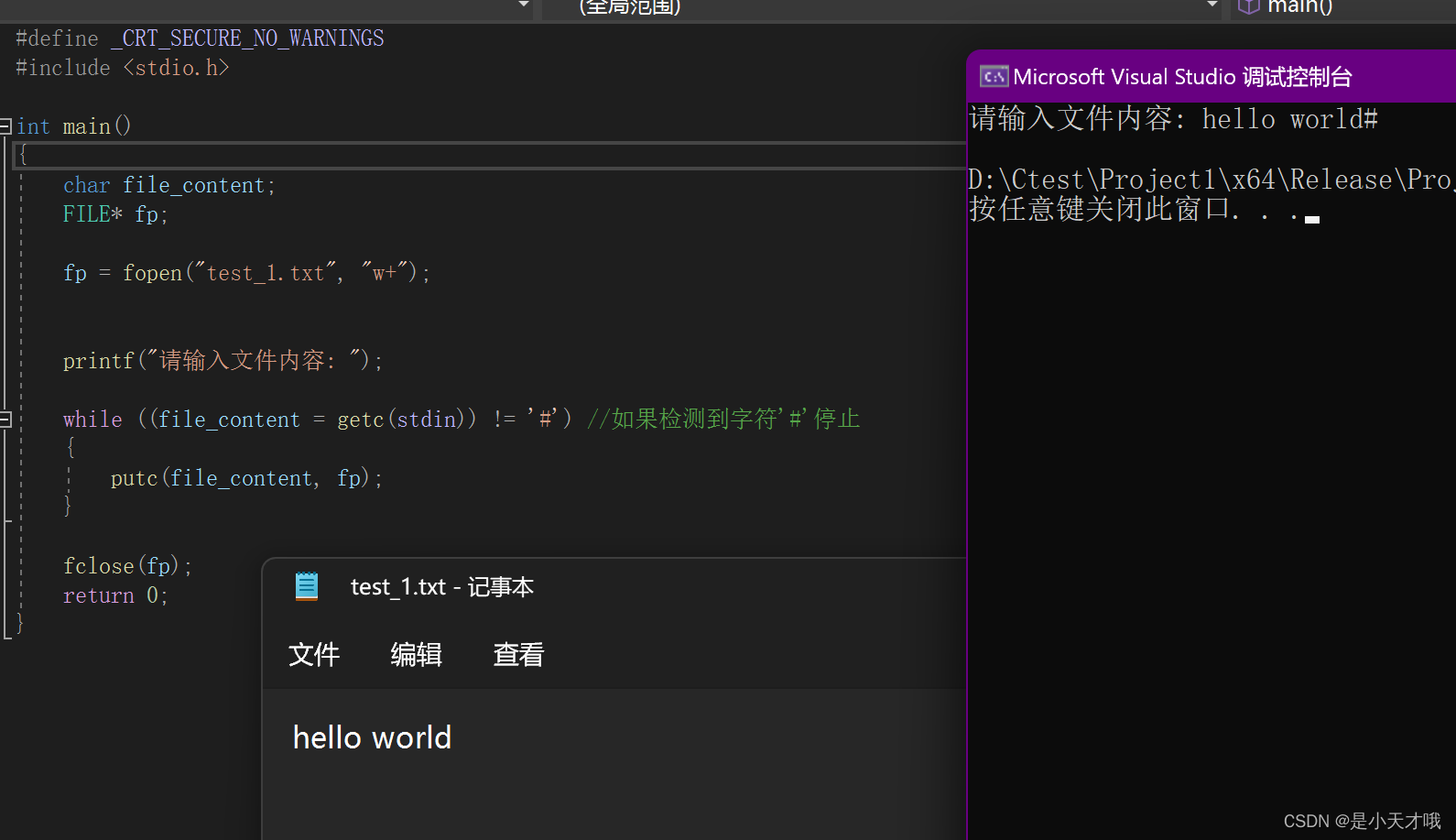 这里用getc从标准输入(stdin)逐步读取字符,并检测是否是'#'字符,检测到'#'字符则停止向文件当中写入字符。这里用putc将字符写入文件当中。