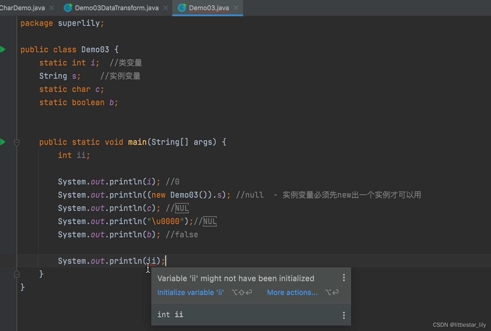 如果局部变量ii没有进行初始化赋值,IDEA会帮助我们报warning: