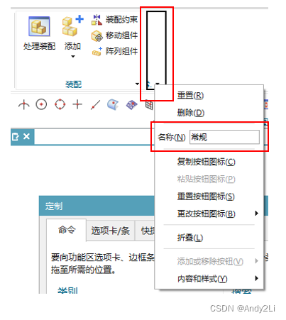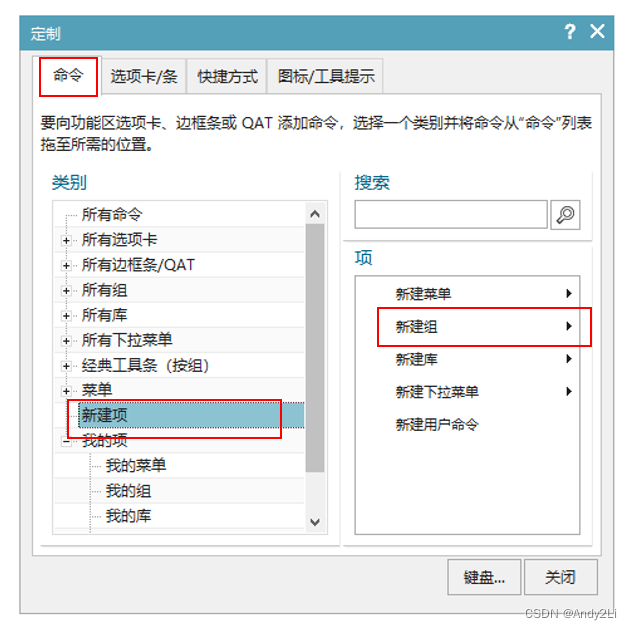 将新建组左键选取长按,拖动到命令栏,即可添加分组