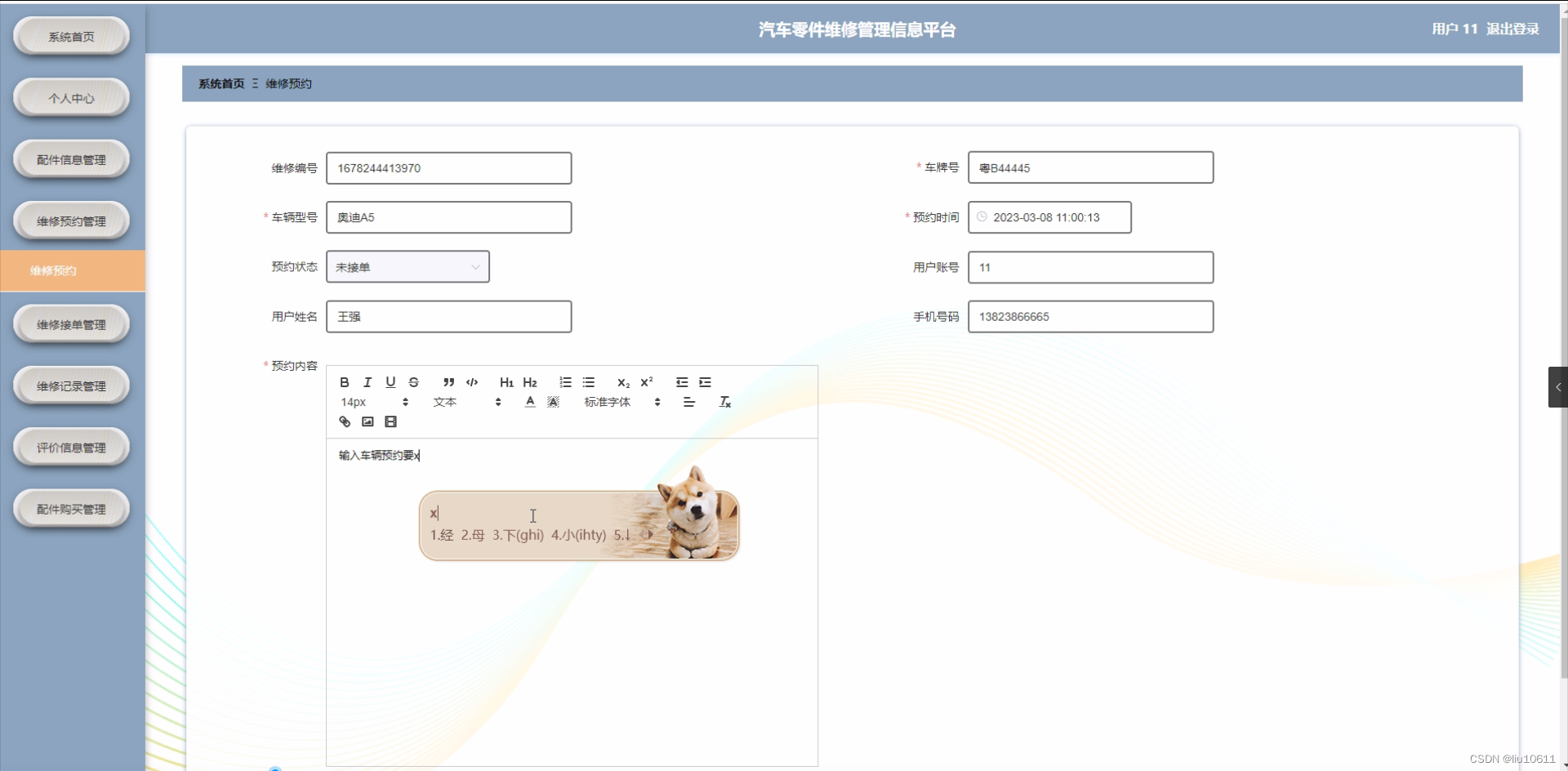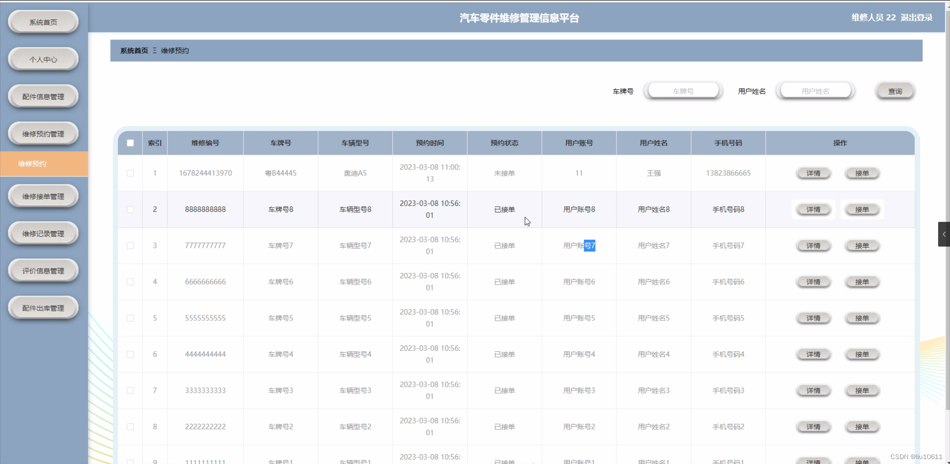 研究目的: 本研究的目的是设计和实现一个汽车零件维修管理信息平台,提供用户友好的界面和丰富的功能,以满足企业对用户、维修人员、供应商等方面的高效管理和监控的需求。通过用户、维修人员、供应商、配件信息、维修预约、维修接单、维修记录、评价信息、配件采购、配件出库、配件购买等功能的设计,实现对汽车零件维修全过程的管理,包括维修预约处理、订单接单等环节。