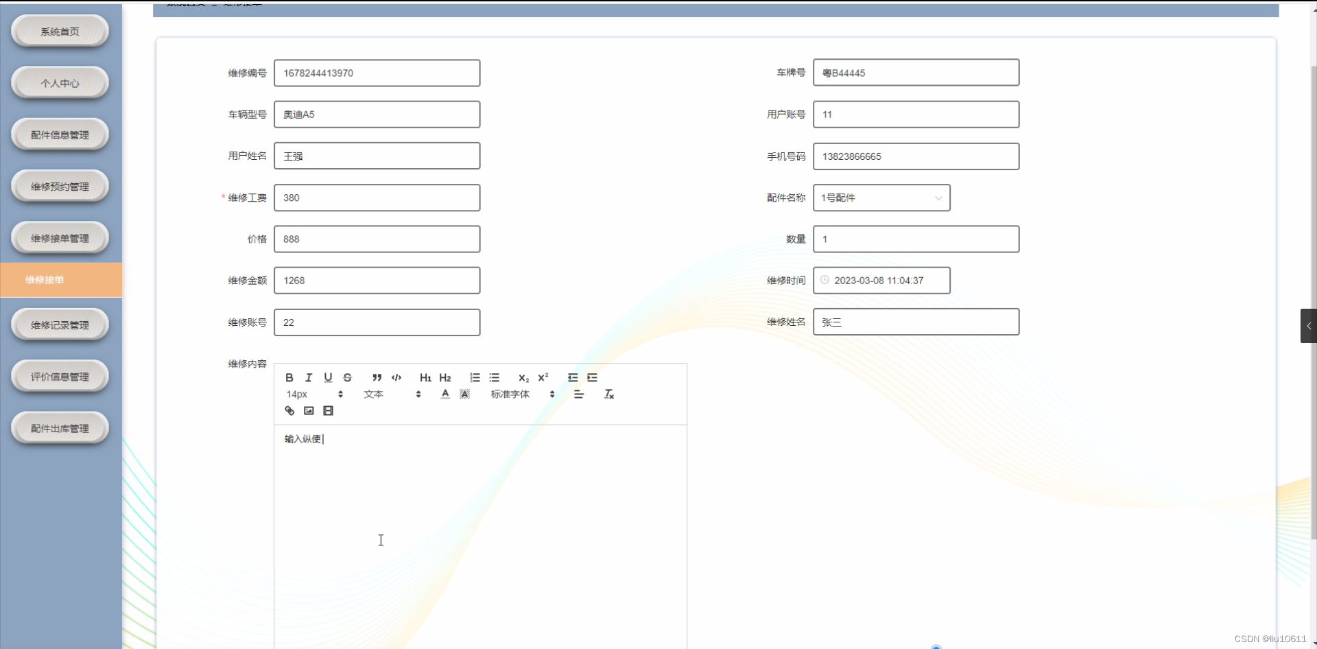 研究意义: 该研究的意义在于提供一个便捷、高效的汽车零件维修管理信息平台,满足企业对用户、维修人员、供应商等方面的高效管理和监控的需求。通过用户、维修人员、供应商、配件信息、维修预约、维修接单、维修记录、评价信息、配件采购、配件出库、配件购买等功能的设计,可以方便地管理和监控汽车零件维修全过程,提高管理效率和客户满意度。
