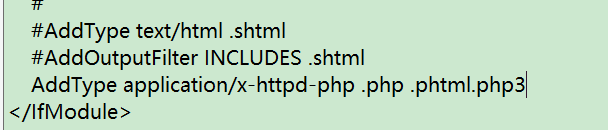 打开配置文件打到 <IfModule mime_module>……</IfModule>这部分内容,将 AddType application前的#号去掉,然后在后面添加.phtml和.php3