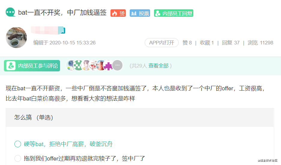 可眼下各个大厂像是“串通一气”迟迟不开奖,中厂倒是逼得紧啊。这不有受苦受难的同志在某客上又求助了。大家也可以在文末评论,出出注意,到底要不要选中厂?