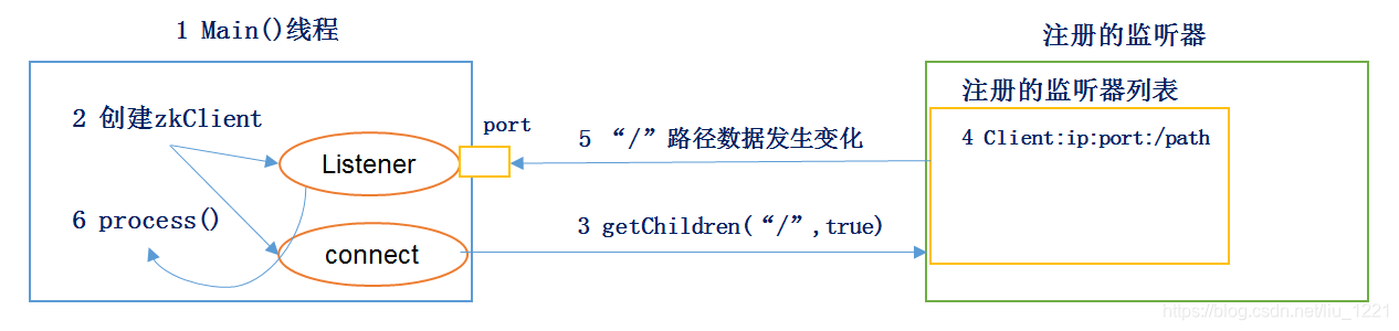 5)Zookeeper监听到有数据或路径变化,就会将这个消息发送给listener线程。