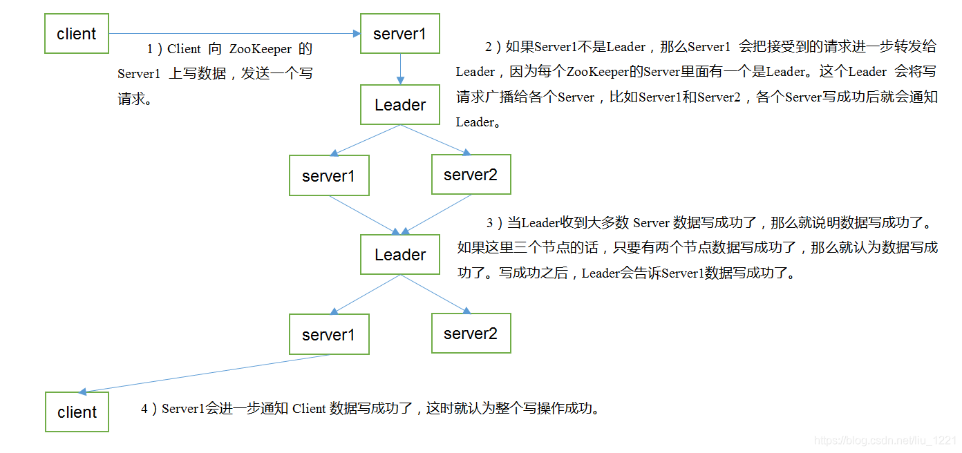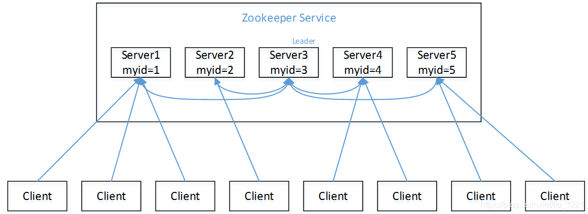 (1)服务器1启动,此时只有它一台服务器启动了,它发出去的报文没有任何响应,所以它的选举状态一直是LOOKING状态。