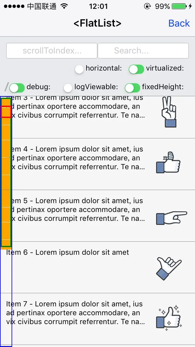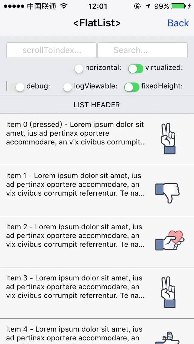 上面的内容是FB的uiexplorer里面的例子,代码可以查看FlatListExample,下面分析下源码: