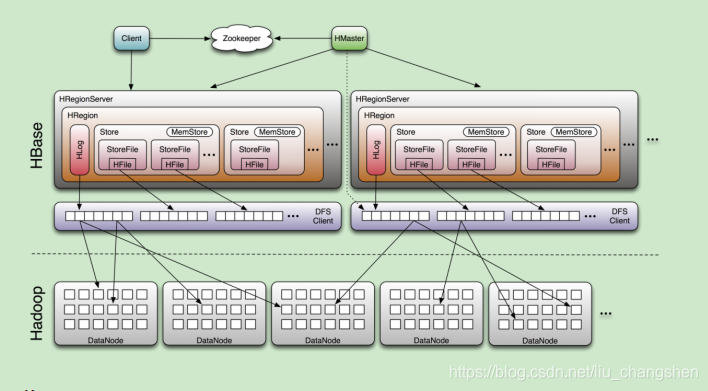 备注:RegionServer的作用是管理region、承接业务的访问,这个后面会详细的介绍通过横向添加Datanode的机器,进行存储层扩容,提升Hbase的数据存储能力和提升后端存储的读写能力。