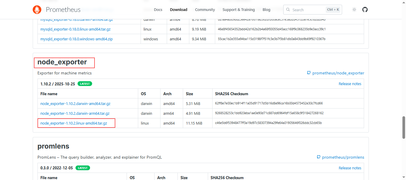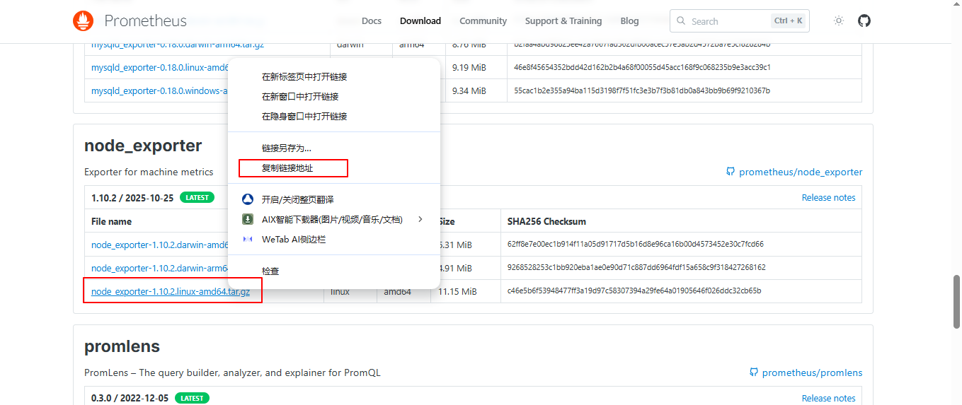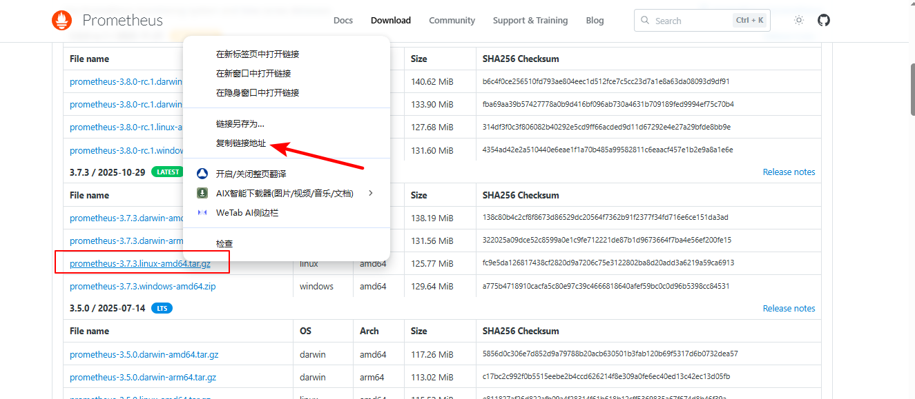 官网下载地址:https://prometheus.io/download/,找到自己要下载的版本,右击点击复制连接,复制到linux中使用