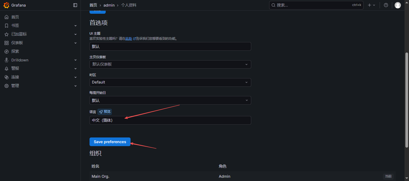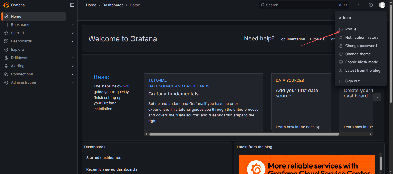 - 登录 Grafana 后,点击页面右上角的用户头像,在下拉菜单中选择「Profile」。