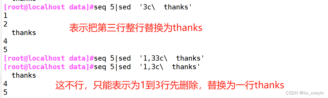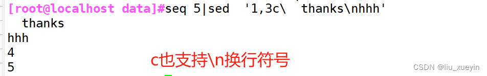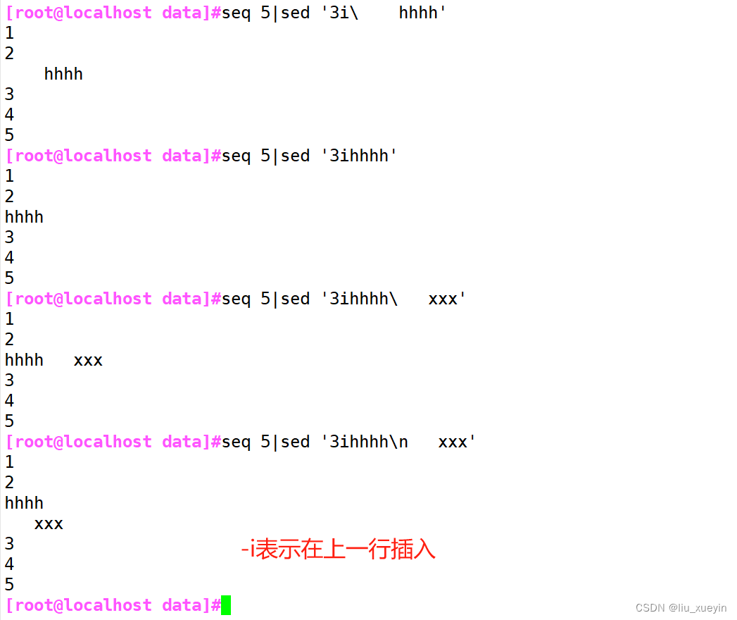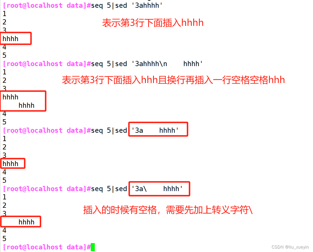 [root@localhost data]#seq 5|sed '3ahhhh\n hhhh'