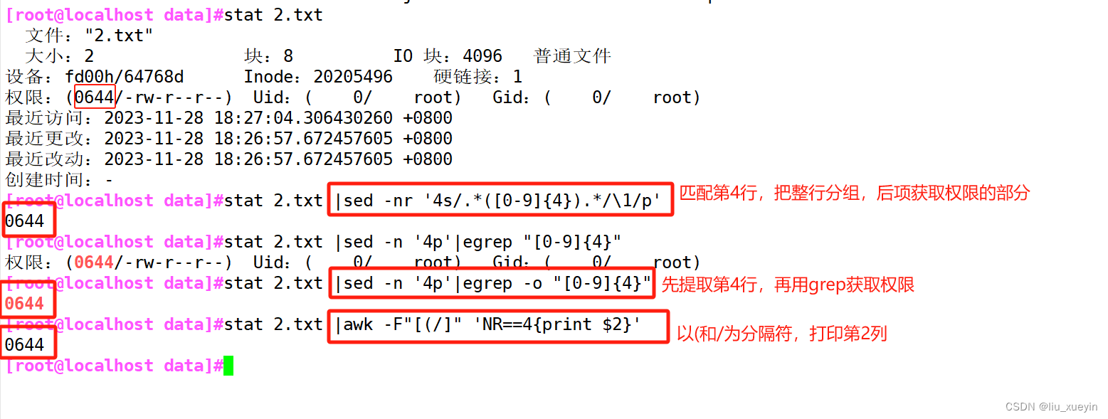 [root@localhost data]#stat 2.txt |awk -F"[(/]" 'NR==4{print $2}'