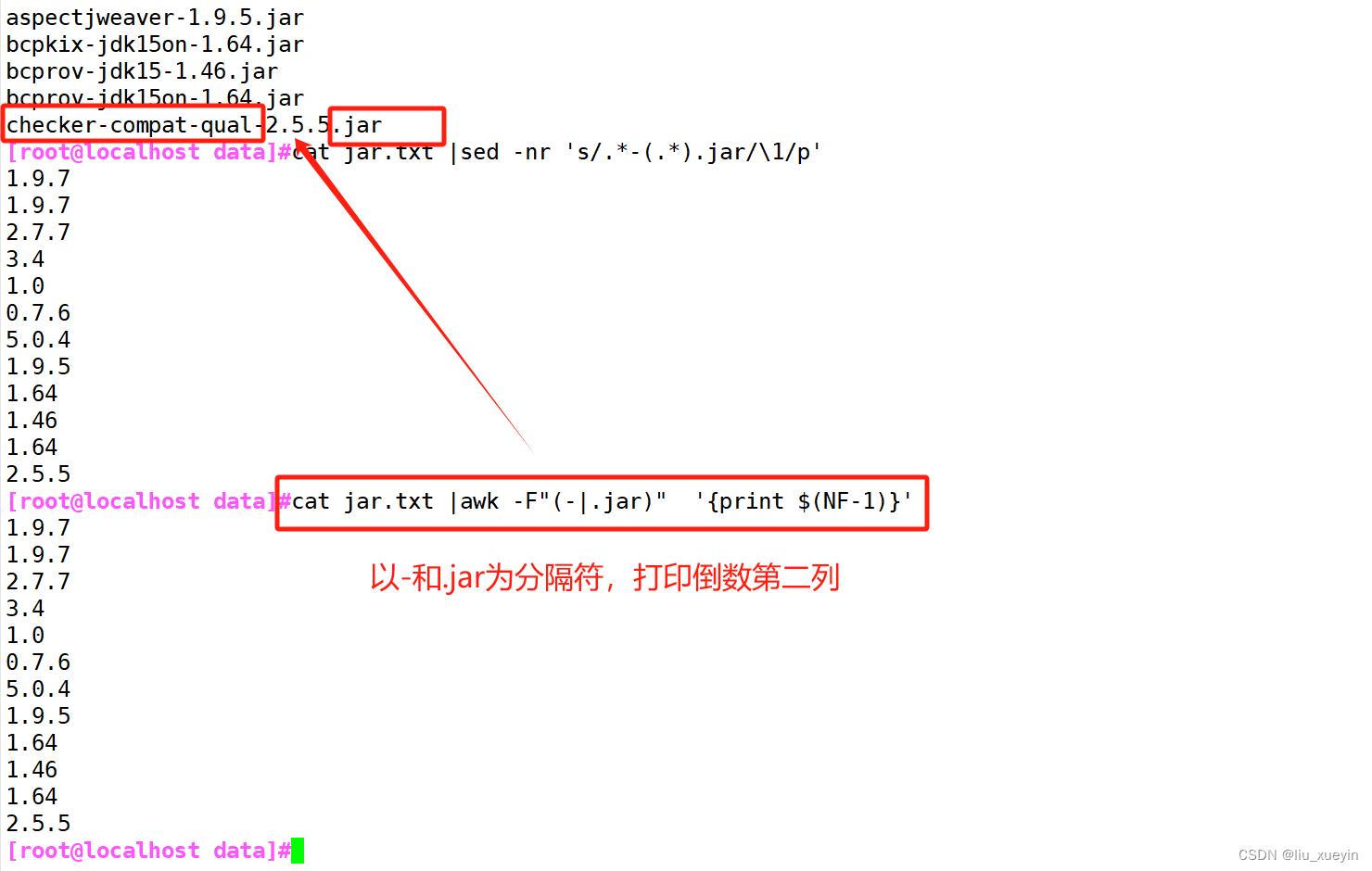 [root@localhost data]#cat jar.txt |awk -F"(-|.jar)" '{print $(NF-1)}'