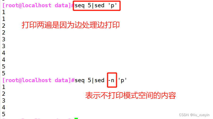 p:打印,如果是同时指定行,表示打印指定行;如果不指定行,则表示打印所有内容;如果有非打印字符,则以ASCII码输出。其通常与“-n”选项一起使用。