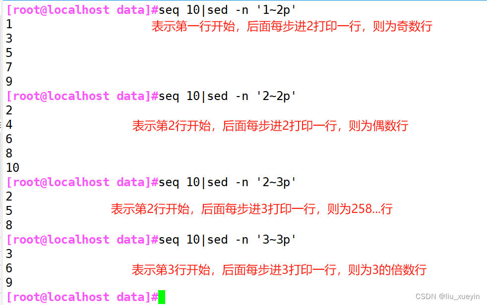 sed -n '2,${n;p}' 表示奇数行,表示从第二行开始,先放入高级空间,下一行打印,反复以往,表示打印奇数行