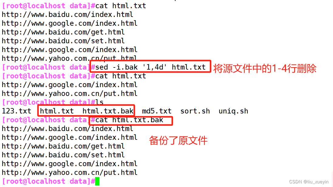 [root@localhost data]#sed -i.bak '1,4d' html.txt