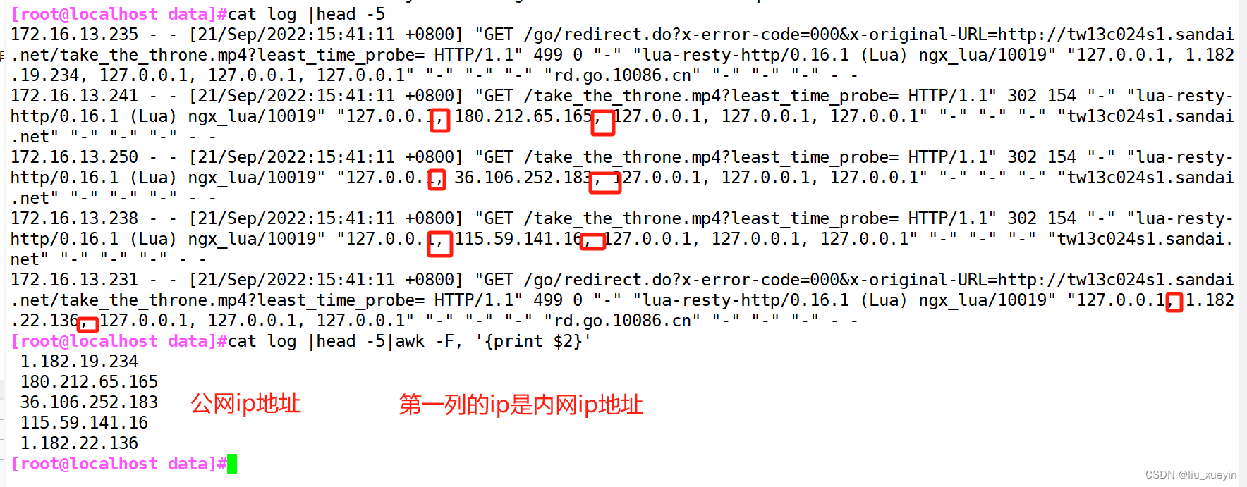 [root@localhost data]#cat log |head -5|awk -F, '{print $2}'