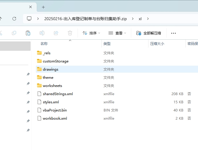 将“出入库登记制单与台账归集助手.xlsm”直接修改文件后缀名为.zip