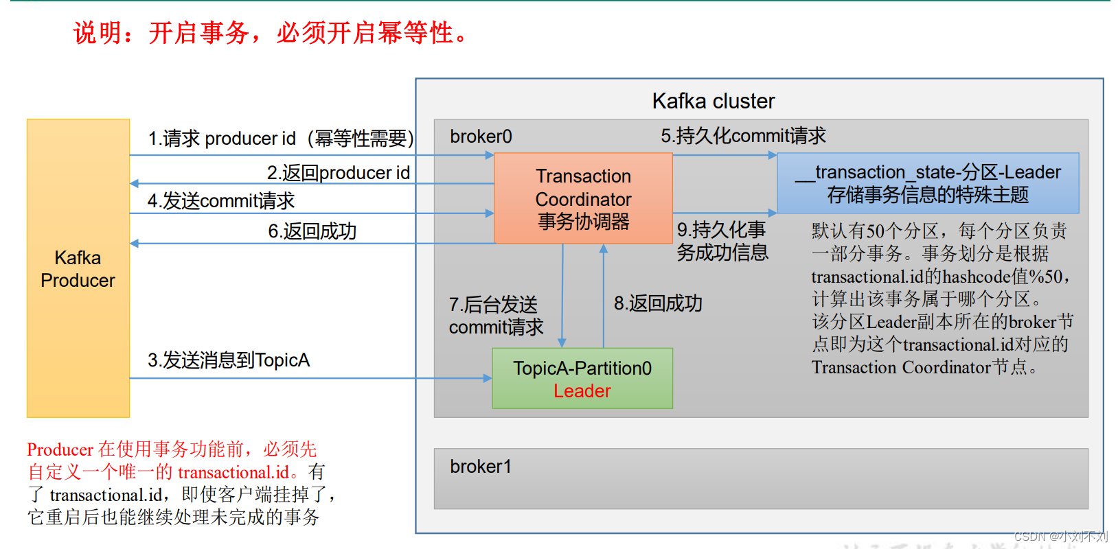 使用幂等性的缺陷是如果kafka宕机,消息仍然可能重复发送,那为了保证重启后,仍然处理未完成的事务,这里就引入了事务。