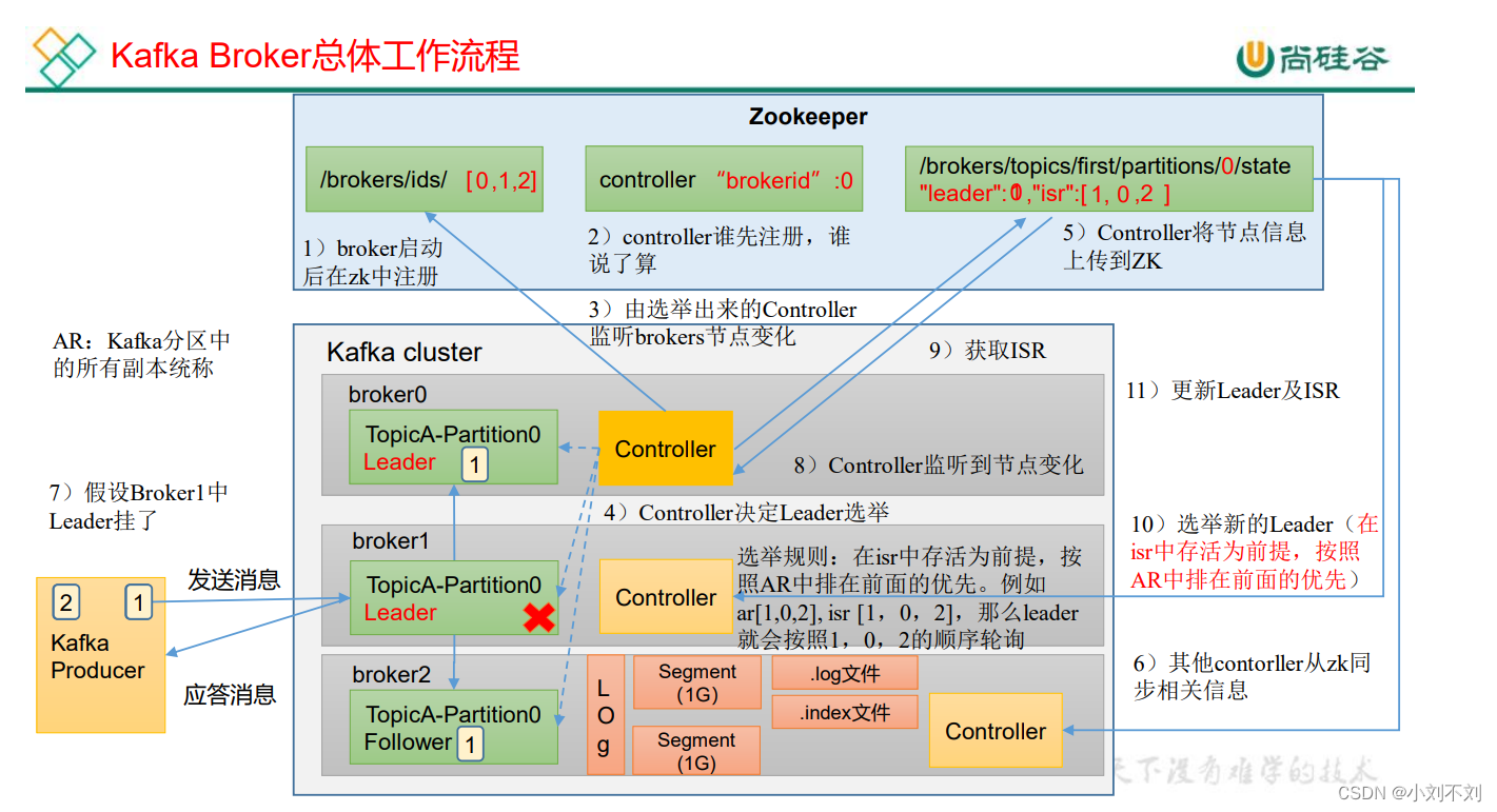 7.如果leader挂了怎么办,controller监听到了ids,然后重新选举leader,将新的leader信息以及isr信息上传。这是broker的整个工作流程。