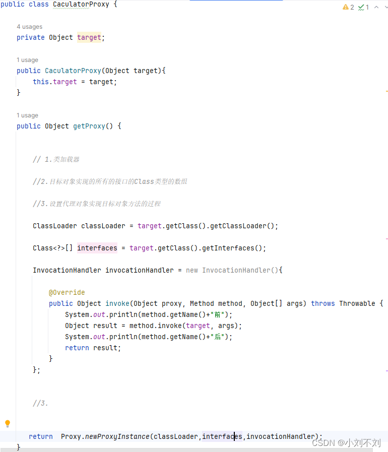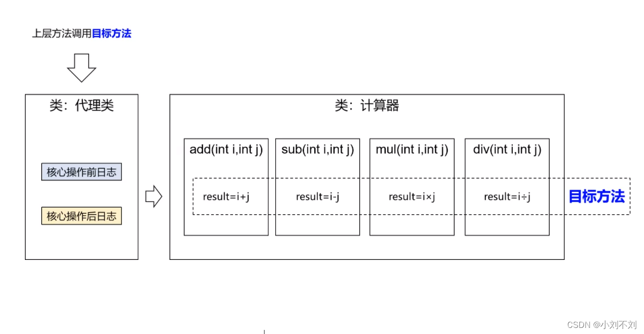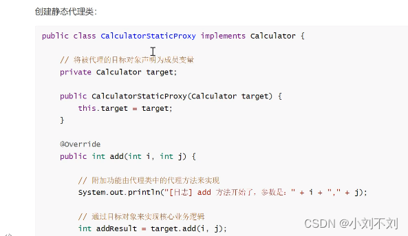 它的作用是提供一个代理类,让我们在调用目标方法的时候,不是直接调用目标方法,而是通过代理方式间接调用。让不属于目标方法的核心逻辑代码从目标方法中剥离出来,以达到解耦的操作。
