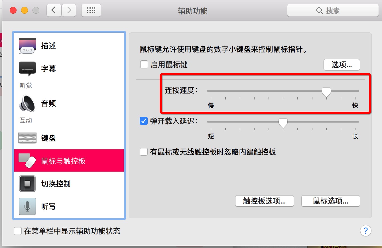 系统偏好设置 -> 辅助功能 -> 互动里的鼠标与触控板 -> 把连按速度调慢