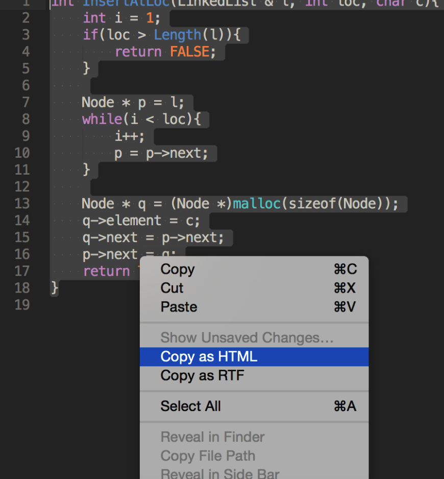 选中代码并右键,选择copy as HTML(html 格式) 或者 copy as RTF(富文本格式)